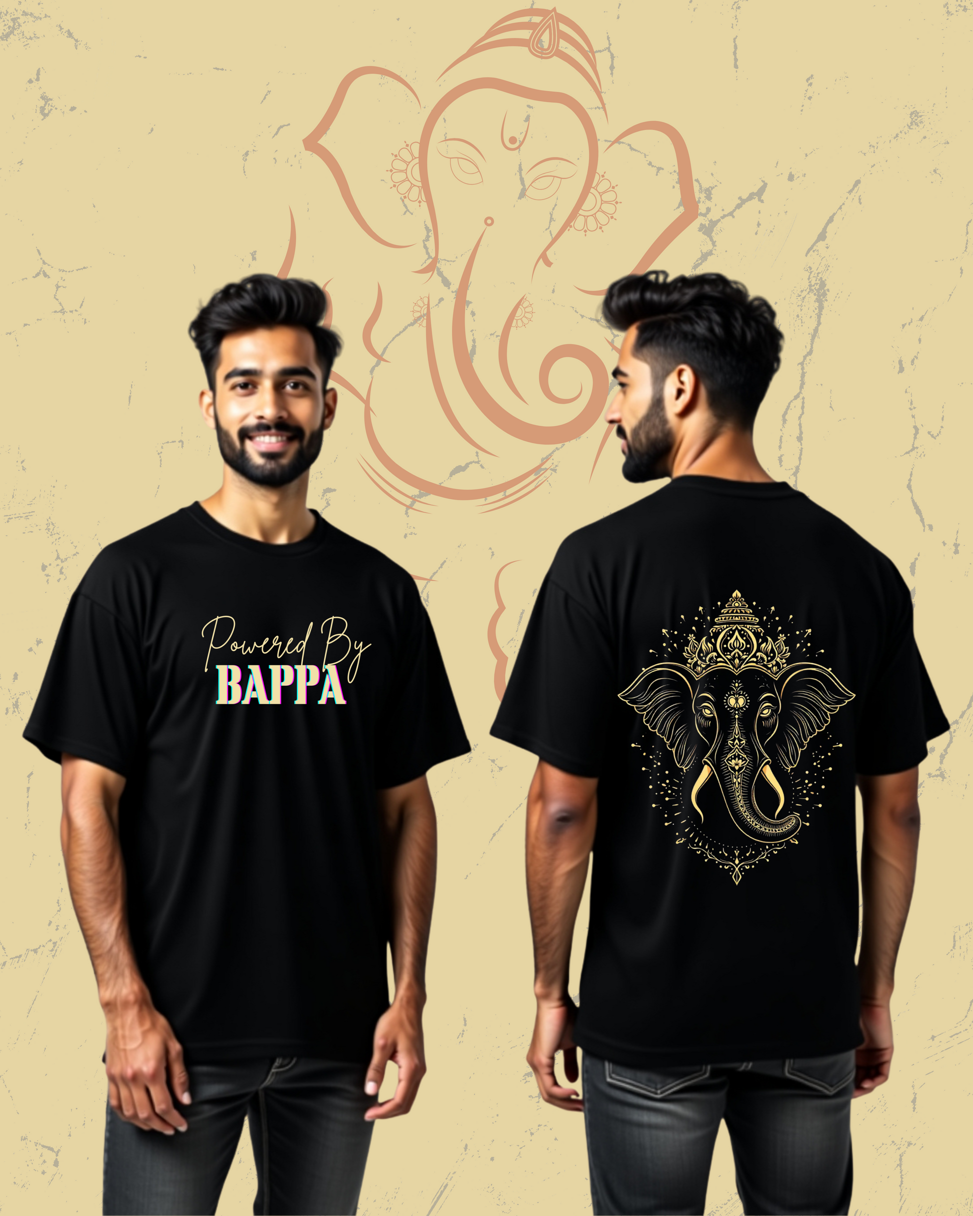 Featuring a bold front typography "Powered By Bappa" 💪 and an intricate golden Lord Ganesha artwork 🎨🪔 on the back, this limited-edition t-shirt blends spirituality with trendy streetwear fashion. Perfect for festive gatherings, casual outings, or as a thoughtful gift 🎁.